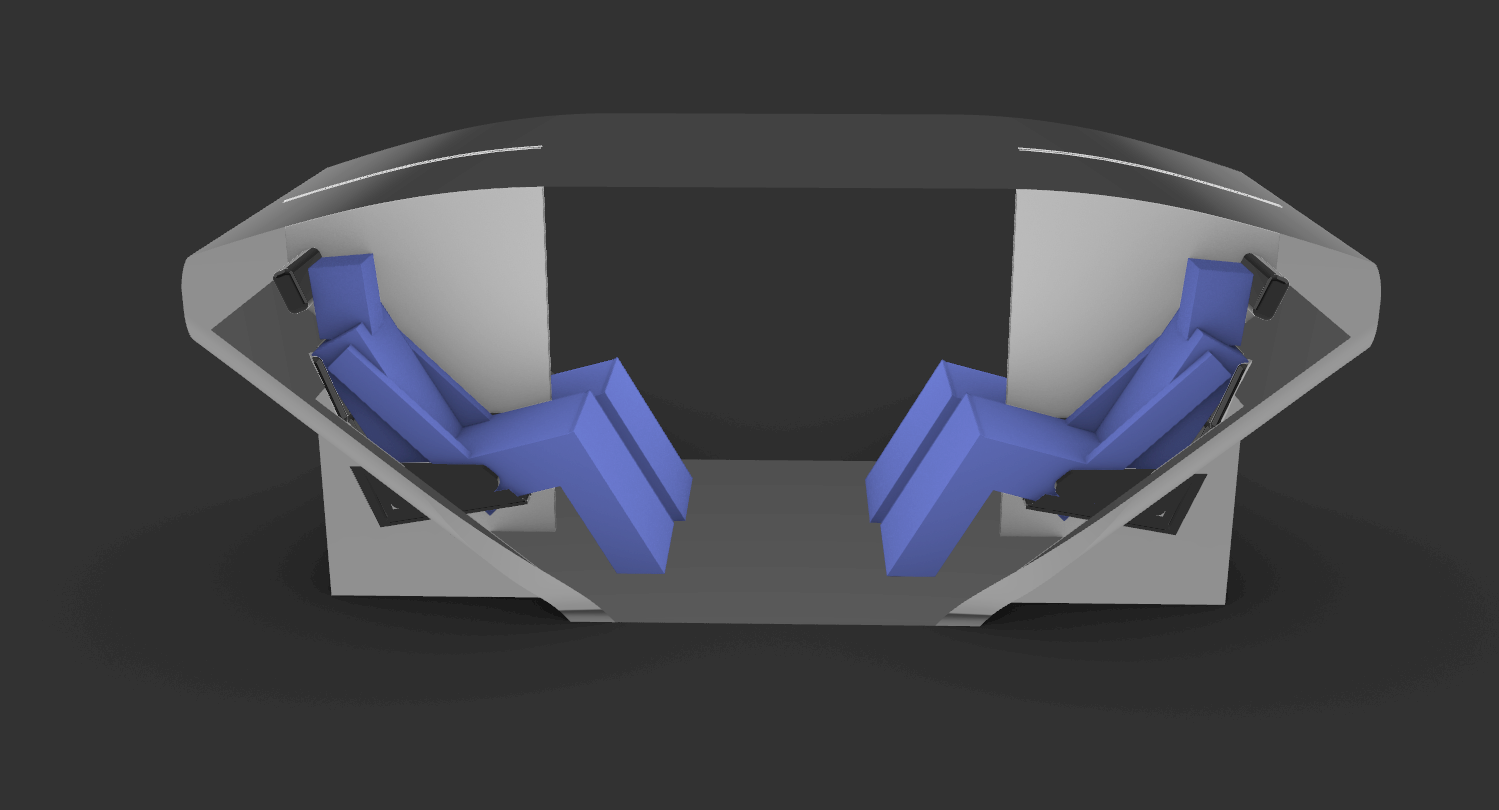 Passengers sit facing each other to make the most of the usable space. Additionally, the seating position was chosen to make the passengers look at the sealing, avoiding direct eye contact, and ensure a comfortable and nondistracting journey.